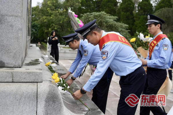 “我志愿加入中国共产党……”全体党员民警面向党旗,高举右拳,重温入党誓词。随后,小朋友们在老师的带领下,轻声跟读“我爱祖国,我要向英雄学习!”,稚嫩而坚定的的跟读声,在纪念碑前久久回响。