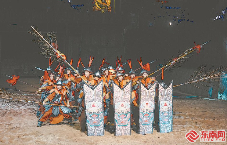 最引人入胜的节目当数在平安堡上演的《荡寇风云》。约50分钟的表演融入武术、马术、特技等多种技巧,带领观众回到明代戚继光抗倭的历史场景。抗倭练兵、平倭战争、塔楼炸裂等场景在演出中一一呈现,还讲述了莆田“初二不串门,初四过大年,贴白头春联”的独特春节习俗起源。整场演出气势磅礴、扣人心弦,引得观众掌声雷动。