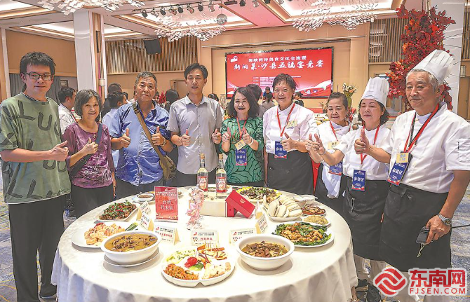 近日,海峡两岸美食文化交流暨新闽菜·沙县五福宴竞赛活动在三明市沙县区举办,来自海峡两岸的13支代表队100余名选手围绕五福寓意,同台竞技,推出各自的“主题特色宴”。图为台湾代表队在作品前合影留念。