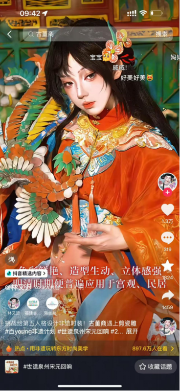 在抖音平台的300多个短视频作品中,泉州非遗不再是博物馆中的标本,而是化身可体验、可传播的“生活美学”。创新文旅推介,讲好泉州故事,以文塑旅,以旅彰文。要让泉州成为全国最具烟火气的旅游城市、世界海丝多元文化旅游目的地,讲好泉州故事是一条重要路径。 本月“泉州世遗宋元回响”话题的火热,也离不开达人们在文旅推介上的创新。不少达人借助AI人工智能手段,还原泉州的千年历史。来自四川的传统文化创作者刘玉,拥有485万粉丝,他在泉州市南音传承中心体验学习南音。以我国十大名画《韩熙载夜宴图》为切入点,特地为画中场景编曲,让名画“活”起来。他的短视频,不仅让百万网友看见古人生活娱乐场景,而且也深入挖掘千年南音文化价值。