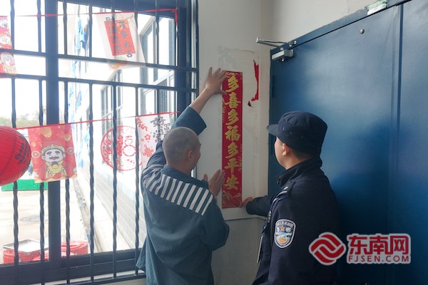在闽西监狱民警的指导和组织下,一名罪犯在贴春联 闽西监狱供图