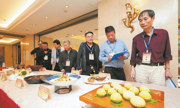 在去年底举行的“新闽菜·最闽南”2023泉州山海厨王争霸赛晋江选拔赛上,评委们对菜品进行打分。(受访单位供图)
