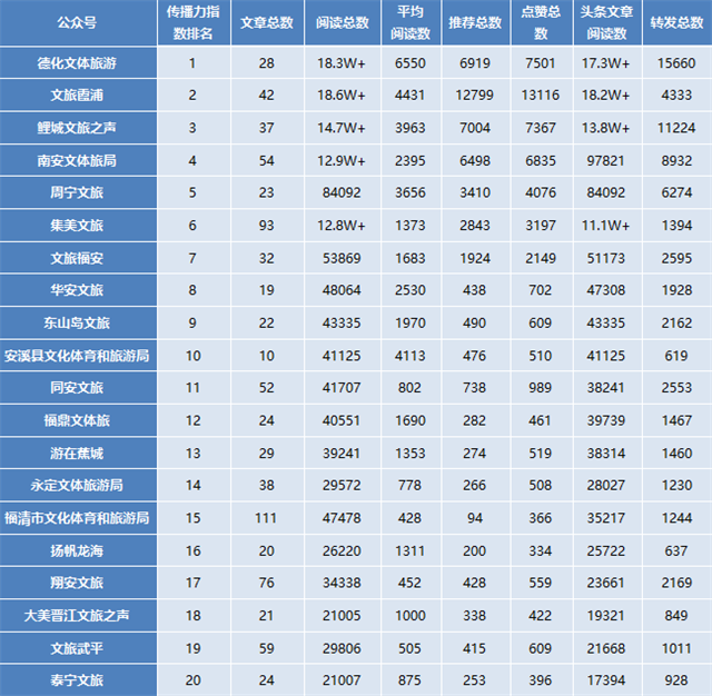 福建省各县(市、区)文化和旅游政务微信公众号10月传播力指数TOP20 监测结果显示,10月共有67个县级文化和旅游政务微信公众号在更新、发布新内容。综合各项传播数据,10月福建省各县(市、区)文化和旅游政务微信公众号传播影响力指数前20名依次是:德化文体旅游(泉州市德化县)、文旅霞浦(宁德市霞浦县)、鲤城文旅之声(泉州市鲤城区)、南安文体旅局(泉州南安市)、周宁文旅(宁德市周宁县)、集美文旅(厦门市集美区)、文旅福安(宁德福安市)、华安文旅(漳州市华安县)、东山岛文旅(漳州市东山县)、安溪县文化体育和旅游局(泉州市安溪县)、同安文旅(厦门同安区)、福鼎文体旅(宁德市福鼎市)、游在蕉城(宁德市蕉城区)、永定文体旅游局(龙岩市永定区)、福清市文化体育和旅游局(凯发k8福清市)、扬帆龙海(漳州市龙海区)、翔安文旅(厦门市翔安区)、大美晋江文旅之声(泉州晋江市)、文旅武平(龙岩市武平县)、泰宁文旅(三明市泰宁县)。 10月,福建省各县(市、区)文化和旅游政务微信公众号阅读总数最多的是文旅霞浦,阅读总量为18.6万余次;其次是德化文体旅游,有18.3万余次;阅读总量超过1万次的总共有36个微信公众号,阅读量5000至1万次的有11个微信公众号。 获得点赞次数最多的是文旅霞浦,有13116次;其次是德化文体旅游,有7501次;鲤城文旅之声第3,有7367次。 推荐总数最多的是文旅霞浦,有12799次;其次是鲤城文旅之声,有7004次;德化文体旅游第3,有6919次。 转发数最多的是德化文体旅游,有15660次;其次是鲤城文旅之声,有11224次;南安文体旅局排第3,有8932次。 福建省各县(市、区)文化和旅游政务新媒体传播力指数涵盖11个县级市、31个市辖区和42个县(含金门县)的文化和旅游行政部门官方微信公众号,评价维度包括整体传播力、篇均传播力、头条传播力和峰值传播力4个方面,权重分别为60%、20%、10%、10%。 福建省文化和旅游厅政务新媒体传播力指数(国内)研究由中国旅游报社、中国社会科学院中国舆情调查实验室和阿里巴巴集团共同组建的文旅产业指数实验室主导,联合清博智能、抖音、问卷网等新媒体与大数据联盟成员机构共同实施。