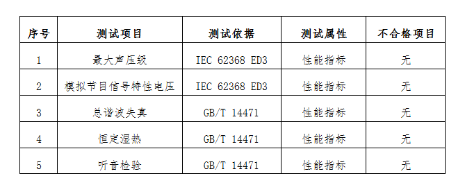 二、检验标准及项目 本次比较试验样品委托福建省产品质量检验研究院以GB/T 14471-2013 《头戴耳机通用规范》等标准,对样品听音检验、最大声压级、模拟节目信号特性电压、总谐波失真、恒定湿热试验5个项目进行测试。比较试验结果仅对购买的样品负责,不代表同品牌不同批次、不同型号商品的质量状况。 三、比较试验结果分析 从本次耳机产品比较试验情况来看,20款样品全部符合相关标准要求。具体如下: 表二(点击图片放大查看)