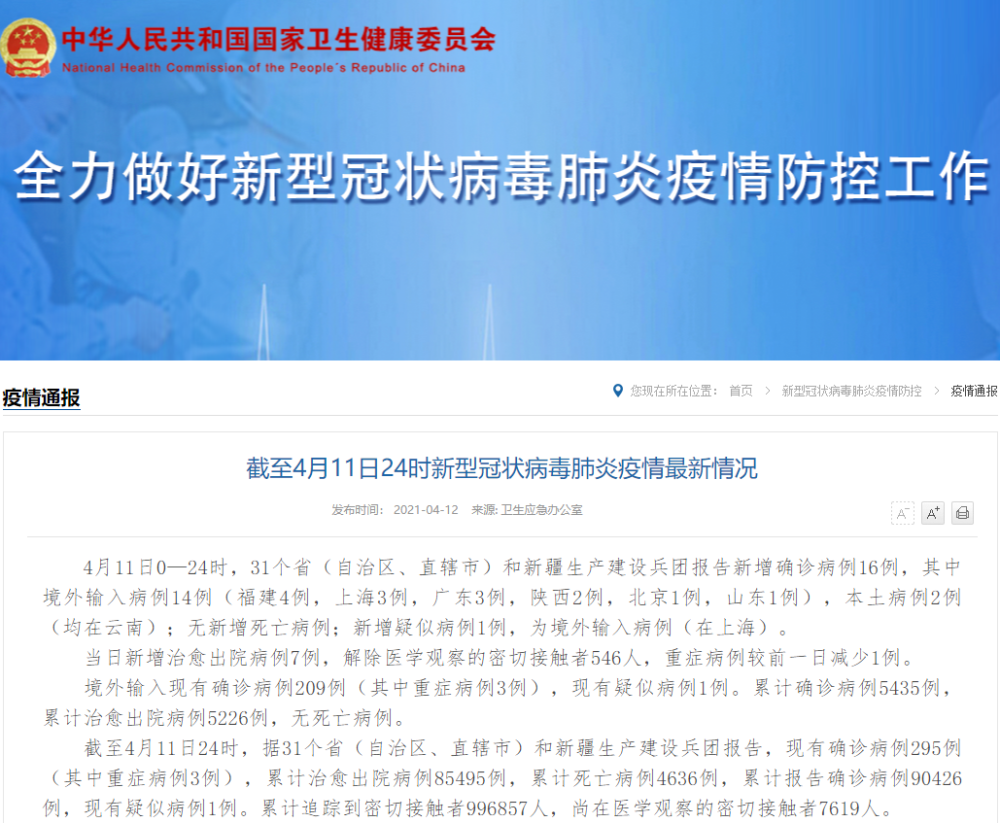 截至4月11日24时新型冠状病毒肺炎疫情最新情况 4月11日0—24时,31个省(自治区、直辖市)和新疆生产建设兵团报告新增确诊病例16例,其中境外输入病例14例(福建4例,上海3例,广东3例,陕西2例,北京1例,山东1例),本土病例2例(均在云南);无新增死亡病例;新增疑似病例1例,为境外输入病例(在上海)。 当日新增治愈出院病例7例,解除医学观察的密切接触者546人,重症病例较前一日减少1例。 境外输入现有确诊病例209例(其中重症病例3例),现有疑似病例1例。累计确诊病例5435例,累计治愈出院病例5226例,无死亡病例。 截至4月11日24时,据31个省(自治区、直辖市)和新疆生产建设兵团报告,现有确诊病例295例(其中重症病例3例),累计治愈出院病例85495例,累计死亡病例4636例,累计报告确诊病例90426例,现有疑似病例1例。累计追踪到密切接触者996857人,尚在医学观察的密切接触者7619人。 31个省(自治区、直辖市)和新疆生产建设兵团报告新增无症状感染者12例(均为境外输入);当日转为确诊病例2例(均为境外输入);当日解除医学观察5例(均为境外输入);尚在医学观察无症状感染者301例(境外输入276例)。 累计收到港澳台地区通报确诊病例12687例。其中,香港特别行政区11581例(出院11206例,死亡207例),澳门特别行政区49例(出院48例),台湾地区1057例(出院1022例,死亡11例)。