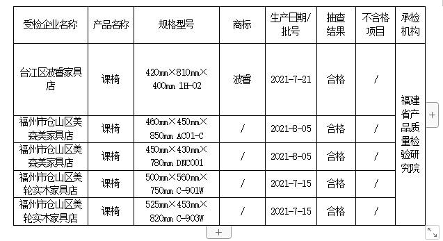 课桌椅的安全性一直是学校家长社会关注的重点,由于学生每天直接接触使用其安全性必须得到充分的保证。有的课桌椅存在危险锐利尖锐物安全隐患,有的课桌椅产品低价甲醛释放量超标,导致学生头晕、头痛等,很容易给孩子们带来伤害。 根据市场监管总局关于开展消费品质量安全进校园活动的要求,近期,福建省市场监管局依据《产品质量法》,组织对学生课桌椅产品质量开展省级监督抽查。共抽查7家销售单位的课桌10批次产品、7家销售单位的课椅10批次产品。 本次抽查依据QB/T 4071-2010 《课桌椅》标准的要求,对课桌的安全性、桌面垂直静载荷、桌面垂直耐久性、桌面垂直冲击、桌腿跌落、桌面水平静载荷、重金属含量(限色漆)、甲醛释放量等8个项目进行了检验;对课椅的安全性、椅子向前倾翻、椅子侧向倾翻(有扶手和无扶手)、椅子向后倾翻、凳子任意方向倾翻、座面椅背联合静载荷、座面侧向静载荷、椅腿向前静载荷、椅腿侧向静载荷、座面冲击、椅背冲击、踏脚静载荷、椅腿跌落、枕靠侧向静载荷、扶手侧向静载荷、重金属含量(限色漆)、甲醛释放量等17个项目进行了检验,未发现不合格产品。 合格产品信息表