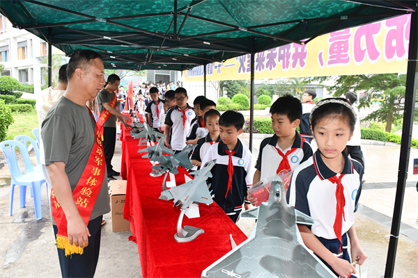 学生参观军事模型 由众心社工组织发起的关爱儿童行动,社会各界爱心人士和志愿者也积极响应,为留守儿童和困境儿童送去了温暖和关爱,衣物、学习用品等礼物满载着社会大家庭的深情厚谊。一位受到帮助的孩子感激地说:“谢谢叔叔阿姨们的关心,我会更加努力学习,不辜负大家的期望。”