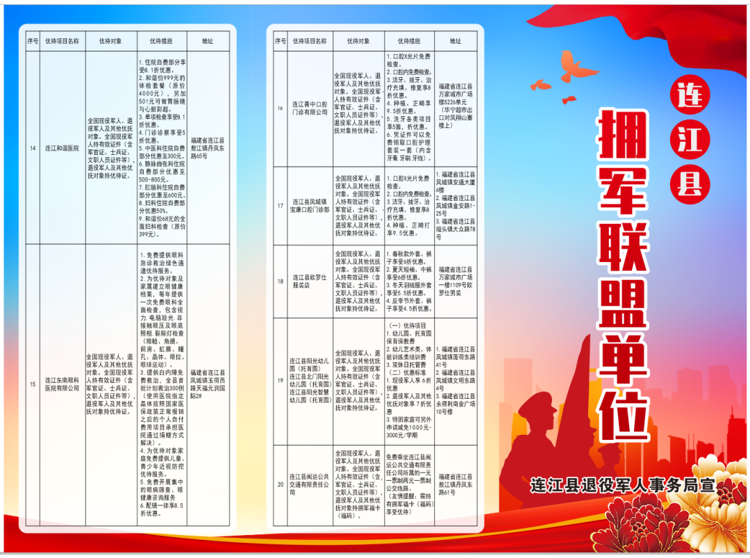 “拥军大联盟”单位优待项目(部分) 根据协议内容,“拥军大联盟”各成员单位将立足自身行业特点和资源优势,聚焦现役军人、退役军人及家属的实际需求,在文旅、教育、医疗、餐饮等多个民生领域精准提供 “三优服务”(优质产品、优先待遇、优惠价格),以实打实的优惠来增强军人军属、退役军人的荣誉感、获得感与幸福感。自2024年5月连江“拥军大联盟”成立以来,社会各界响应热烈,截至目前,已有24家企业踊跃加入,联盟的社会影响力与服务覆盖面持续扩大。 “我们深耕家庭教育领域多年,始终心怀对军人的敬意,希望通过专业服务为军人家庭提供更有力的教育支持。”连江行知教育咨询服务部主理人邵文慧表示 “我十分崇拜军人,所以这次能加入‘拥军大联盟’既喜悦又荣幸。”连江兴达汽车培训有限公司董事长李章财表示,他们计划为全国现役军人、退役军人及其他优抚对象提供驾校培训8.5折的专属优惠。 为现役军人家庭送去立功喜报