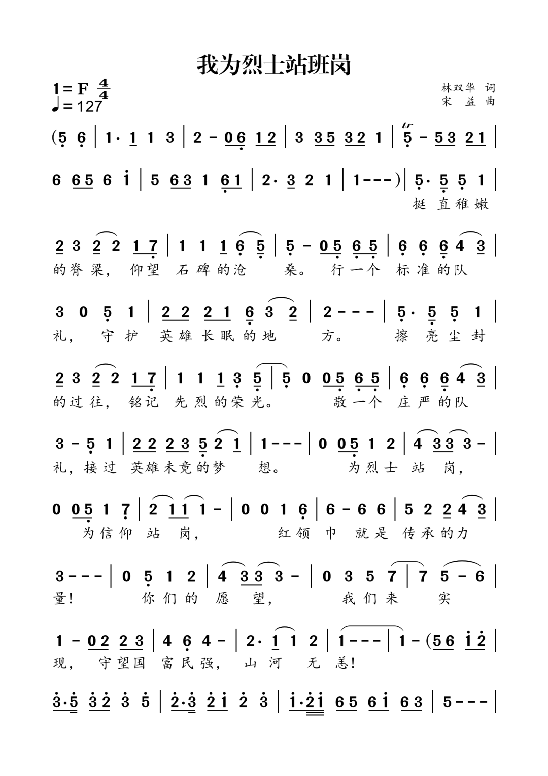 3月27日,省“百园千校清明祭英烈”启动仪式上,莆田市少先队员以“我为烈士站班岗”的实际行动,缅怀革命先烈,感悟英烈精神,赓续红色血脉。中国音乐家协会会员、莆田晚报社总编辑林双华同志深受感动,连夜创作歌词《我为烈士站班岗》,并邀请音乐界等爱心人士谱曲,制作MV。省退役军人事务厅、共青团福建省委予以联合发布,希望广大青少年广泛传唱这首原创歌曲,推广少先队员为烈士站班岗这一红色教育新模式,在全社会形成尊崇英烈、学习英烈的浓厚氛围,让红色基因代代相传。